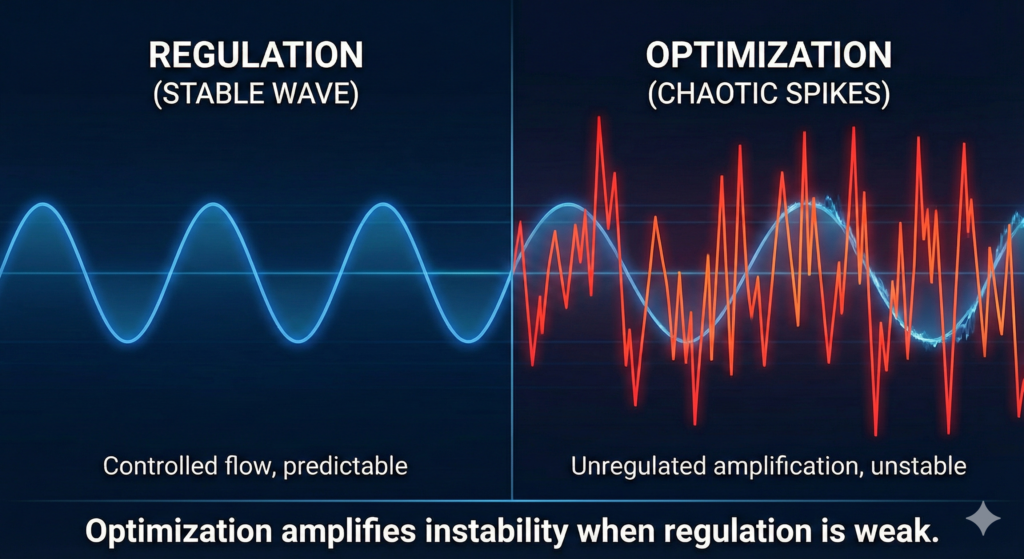 But optimization amplifies instability when regulation is weak.
