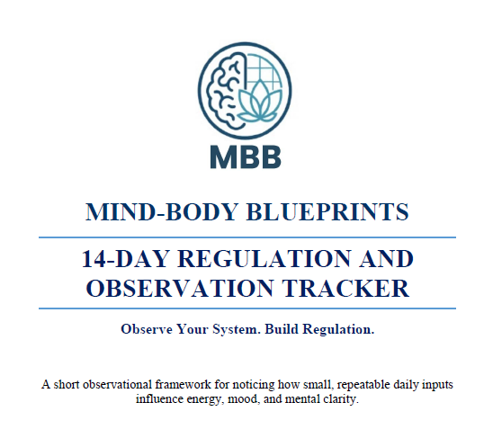 The Mind-Body Blueprints 14-Day Regulation & Observation Tracker provides a simple structure for recording a few daily inputs and noticing how they influence energy, mood, and mental clarity across time.
